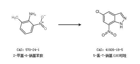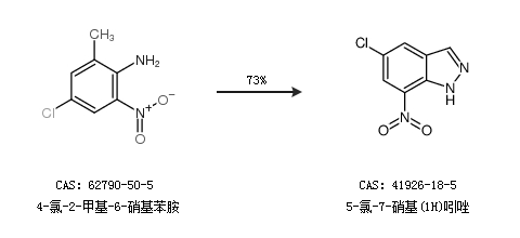 1.通过4-氯-2-甲基-6-硝基苯胺合成5-氯-7-硝基(1H)吲唑,收率约73%;