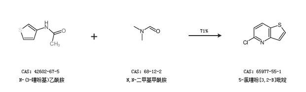 1.通过N-(3-噻吩基)乙酰胺和N,N-二甲基甲酰胺合成5-氯噻吩[3,2-B]吡啶,收率约71%;