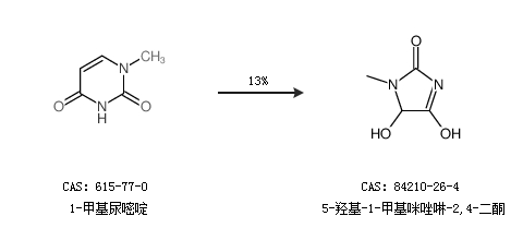 2.通过1-甲基尿嘧啶合成5-羟基-1-甲基咪唑啉-2,4-二酮,收率约13%;