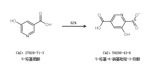 1.通过5-羟基烟酸合成5-羟基-6-硝基吡啶-3-羧酸,收率约62%;