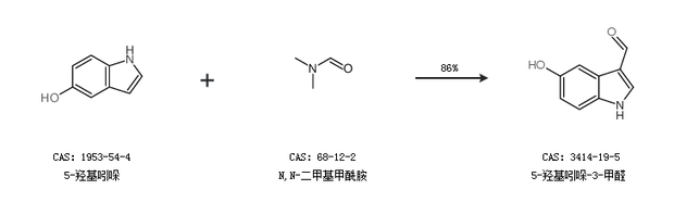 1.通过5-羟基吲哚和N,N-二甲基甲酰胺合成5-羟基吲哚-3-甲醛,收率约86%;