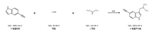 1.通过5-氰基吲哚、甲醛和二甲胺合成5-氰基芦竹碱,收率约91%;