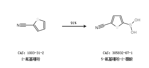 1.通过2-氰基噻吩合成5-氰基噻吩-2-硼酸,收率约91%;