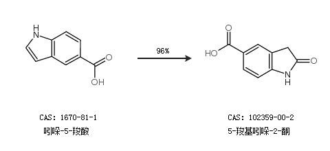 2.通过吲哚-5-羧酸合成5-羧基吲哚-2-酮,收率约96%;