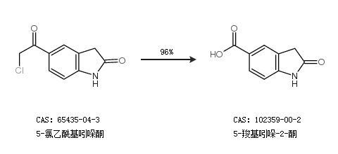 1.通过5-氯乙酰基吲哚酮合成5-羧基吲哚-2-酮,收率约96%;