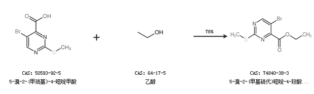 1.通过5-溴-2-(甲巯基)-4-嘧啶甲酸和乙醇合成5-溴-2-(甲基硫代)嘧啶-4-羧酸乙酯,收率约78%;