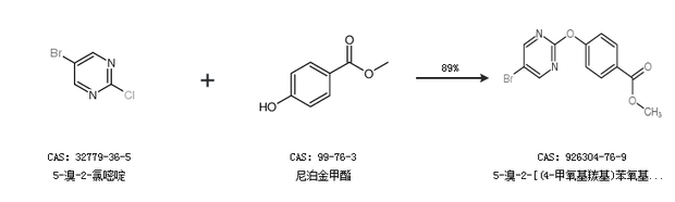 1.通过5-溴-2-氯嘧啶和尼泊金甲酯合成5-溴-2-[(4-甲氧基羰基)苯氧基]嘧啶,收率约89%;