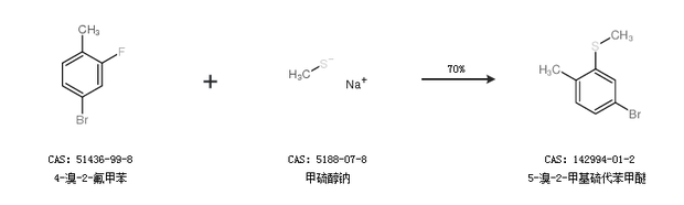1.通过4-溴-2-氟甲苯和甲硫醇钠合成5-溴-2-甲基硫代苯甲醚,收率约70%;