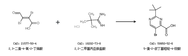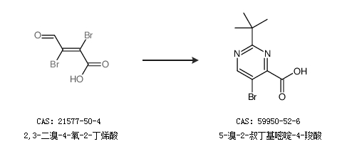 2.通过2,3-二溴-4-氧-2-丁烯酸和2,2-二甲基丙亚胺盐酸合成5-溴-2-叔丁基嘧啶-4-羧酸