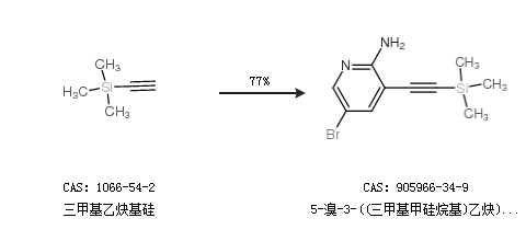 2.通过三甲基乙炔基硅合成5-溴-3-((三甲基甲硅烷基)乙炔)吡啶-2-胺,收率约77%;