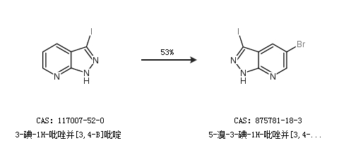 2.通过3-碘-1H-吡唑并[3,4-B]吡啶合成5-溴-3-碘-1H-吡唑并[3,4-B]嘧啶,收率约53%;