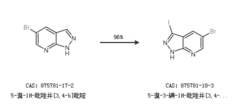 1.通过5-溴-1H-吡唑并[3,4-b]吡啶合成5-溴-3-碘-1H-吡唑并[3,4-B]嘧啶,收率约96%;