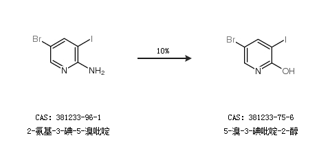 2.通过2-氨基-3-碘-5-溴吡啶合成5-溴-3-碘吡啶-2-醇,收率约10%;