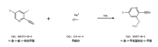 1.通过5-溴-3-氟-2-吡啶甲腈和甲醇钠合成5-溴-3-甲氧基吡啶-2-甲腈,收率约70%;