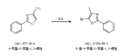 1.通过4-甲基-2-苯基-1,3-噁唑合成5-溴-4-甲基-2-苯基-1,3-噁唑,收率约91%;