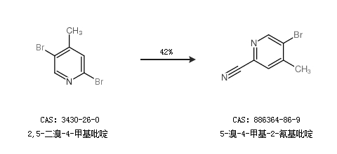1.通过2,5-二溴-4-甲基吡啶合成5-溴-4-甲基-2-氰基吡啶,收率约42%;