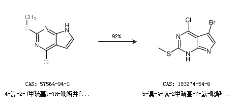 1.通过4-氯-2-(甲硫基)-7H-吡咯并[2,3-D]嘧啶合成5-溴-4-氯-2甲硫基-7-氢-吡咯[2,3-d]嘧啶,收率约92%;