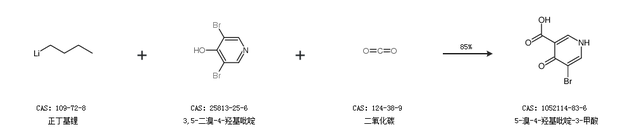 2.通过正丁基锂、3,5-二溴-4-羟基吡啶和二氧化碳合成5-溴-4-羟基吡啶-3-甲酸,收率约85%;