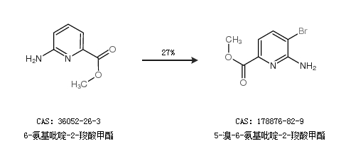 2.通过6-氨基吡啶-2-羧酸甲酯合成5-溴-6-氨基吡啶-2-羧酸甲酯,收率约27%;