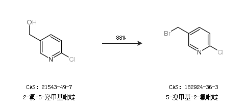 1.通过2-氯-5-羟甲基吡啶合成5-溴甲基-2-氯吡啶,收率约88%;