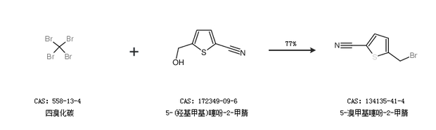 2.通过四溴化碳和5-(羟基甲基)噻吩-2-甲腈合成5-溴甲基噻吩-2-甲腈,收率约77%;