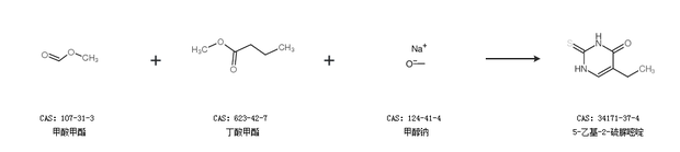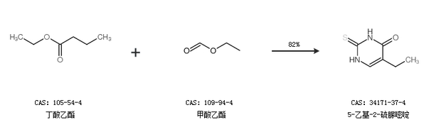 1.通过丁酸乙酯和甲酸乙酯合成5-乙基-2-硫脲嘧啶,收率约82%;