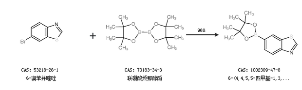 1.通过6-溴苯并噻唑和联硼酸频那醇酯合成6-(4,4,5,5-四甲基-1,3,2-二噁硼烷-2-基)苯并[d]噻唑,收率约96%;
