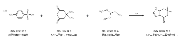 2.通过对甲苯磺酸一水合物、5,5-二甲基-1,3-环己二酮和氨基乙醛缩二甲醇合成6,6-二甲基-6,7-二氢-1氢-吲哚-4(5氢)-酮,收率约4%;