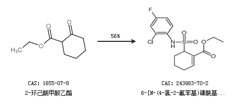 1.通过2-环己酮甲酸乙酯合成6-[N-(4-氯-2-氟苯基)磺酰基]-1-环己烯-1-羧酸乙酯,收率约56%;