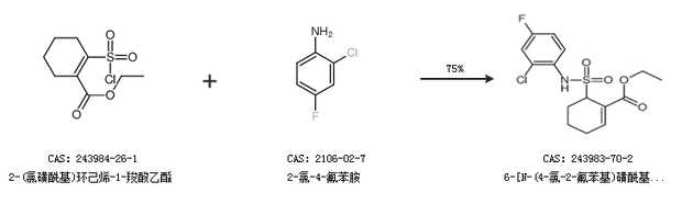 2.通过2-(氯磺酰基)环己烯-1-羧酸乙酯和2-氯-4-氟苯胺合成6-[N-(4-氯-2-氟苯基)磺酰基]-1-环己烯-1-羧酸乙酯,收率约75%;