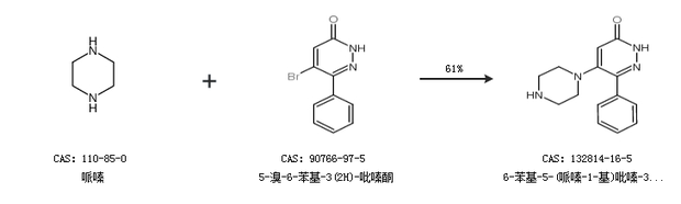 1.通过哌嗪和5-溴-6-苯基-3(2H)-吡嗪酮合成6-苯基-5-(哌嗪-1-基)吡嗪-3(2H)-酮,收率约61%;