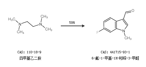 2.通过四甲基乙二胺合成6-氟-1-甲基-1H-吲哚-3-甲醛,收率约59%;