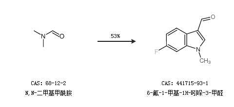 1.通过N,N-二甲基甲酰胺合成6-氟-1-甲基-1H-吲哚-3-甲醛,收率约53%;
