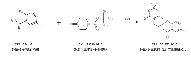 1.通过5-氟-2-羟基苯乙酮和N-叔丁氧羰基-4-哌啶酮合成6-氟-4-氧代螺[苯并二氢吡喃-2,4-哌啶]-1-羧酸叔丁酯,收率约49%;