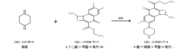 1.通过哌嗪和6,7-二氟-1-甲基-4-氧代-4H-[1,3]噻嗪[3,2-a]并喹啉-3-羧酸乙酯合成6-氟-7-哌嗪-1-甲基-4-氧代-[1,3]硫氮杂环[3,2-a]喹啉-3-羧酸乙酯,收率约85%;
