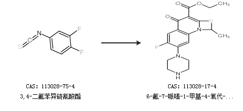 2.通过3,4-二氟苯异硫氰酸酯合成6-氟-7-哌嗪-1-甲基-4-氧代-[1,3]硫氮杂环[3,2-a]喹啉-3-羧酸乙酯