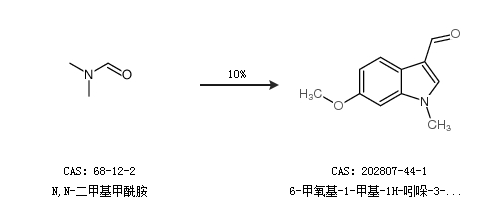 1.通过N,N-二甲基甲酰胺合成6-甲氧基-1-甲基-1H-吲哚-3-甲醛,收率约10%;