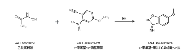 2.通过乙酰氧肟酸和4-甲氧基-2-硝基苯腈合成6-甲氧基-苯并[d]异噁唑-3-胺,收率约56%;