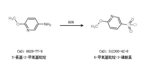 1.通过5-氨基-2-甲氧基吡啶合成6-甲氧基吡啶-3-磺酰氯,收率约60%;