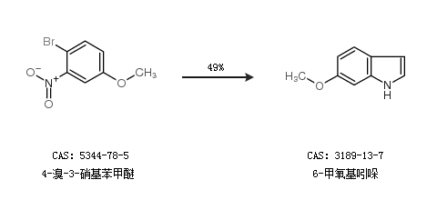 1.通过4-溴-3-硝基苯甲醚合成6-甲氧基吲哚,收率约49%;