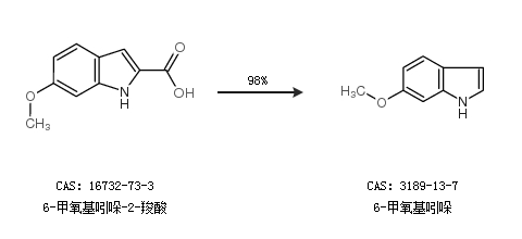 2.通过6-甲氧基吲哚-2-羧酸合成6-甲氧基吲哚,收率约98%;