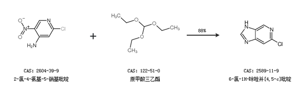 2.通过2-氯-4-氨基-5-硝基吡啶和原甲酸三乙酯合成6-氯-1H-咪唑并[4,5-c]吡啶,收率约88%;