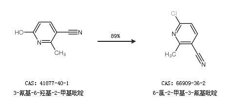 1.通过3-氰基-6-羟基-2-甲基吡啶合成6-氯-2-甲基-3-氰基吡啶,收率约89%;