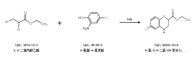 1.通过2,3-二溴丙酸乙酯和2-氨基-4-氯苯酚合成6-氯-3,4-二氢-2H-苯并[1,4]噁嗪-2-羧酸乙酯,收率约74%;