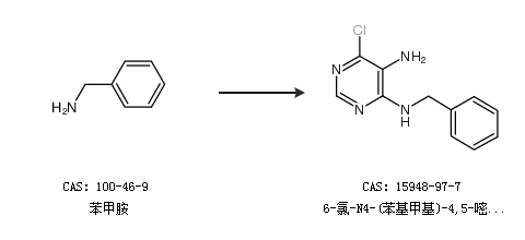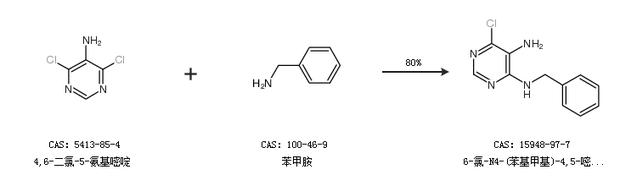 1.通过4,6-二氯-5-氨基嘧啶和苯甲胺合成6-氯-N4-(苯基甲基)-4,5-嘧啶二胺,收率约80%;