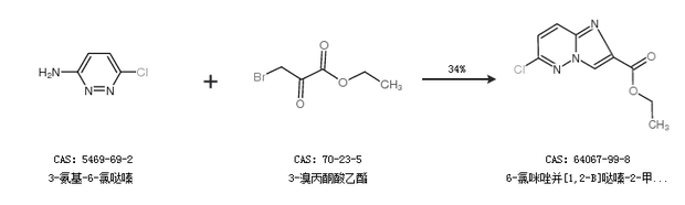 1.通过3-氨基-6-氯哒嗪和3-溴丙酮酸乙酯合成6-氯咪唑并[1,2-B]哒嗪-2-甲酸乙酯,收率约34%;
