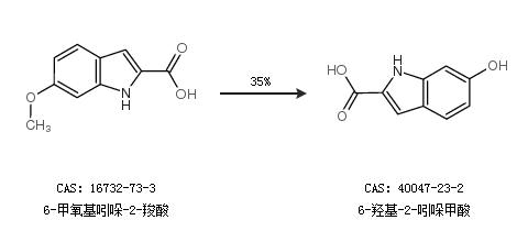 2.通过6-甲氧基吲哚-2-羧酸合成6-羟基-2-吲哚甲酸,收率约35%;