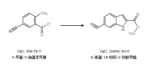 1.通过4-甲基-3-硝基苯甲腈合成6-氰基-1H-吲哚-2-羧酸甲酯
