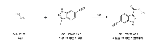 1.通过甲醇和3-碘-1H-吲唑-6-甲腈合成6-氰基-1H-吲唑-3-羧酸甲酯,收率约68%;