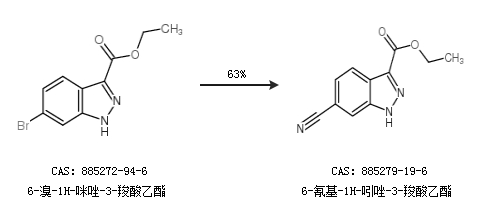 1.通过6-溴-1H-咪唑-3-羧酸乙酯合成6-氰基-1H-吲唑-3-羧酸乙酯,收率约63%;